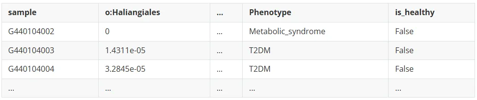 micro.xls, 包含样本名微生物相对丰度数据及疾病类型