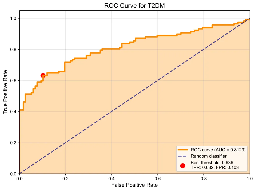 import pandas as pdimport numpy as npimport matplotlib.pyplot as pltimport os,sys# 设置中文字体plt.rcParams['font.sans-serif'] = ['SimHei', 'Arial Unicode MS', 'DejaVu Sans']plt.rcParams['axes.unicode_minus'] = Falsedef plot_auc_curve(prob_file, dataset,y_true_file=None, disease_name="T2DM", output_dir="logistic_models_ggmpOnly"):""" 绘制AUC曲线 Parameters: ----------- prob_file : str 概率文件路径 y_true_file : str, optional 真实标签文件路径,如果为None则从概率文件名推断 disease_name : str 疾病名称 """# 读取概率数据print(f"正在读取概率文件: {prob_file}")prob_df = pd.read_csv(prob_file, sep='\t')# 检查概率文件结构print(f"概率文件列名: {prob_df.columns.tolist()}")print(f"概率文件形状: {prob_df.shape}")# 获取阳性概率(GMWI2_Probability_1)if'GMWI2_Probability_1'inprob_df.columns:y_prob = prob_df['GMWI2_Probability_1']else:raiseValueError("概率文件中未找到合适的概率列")# 从文件读取真实标签y_true_df = pd.read_csv(y_true_file)y_true = y_true_df.values.flatten()# 计算ROC曲线fpr, tpr, thresholds = roc_curve(y_true, y_prob)roc_auc = auc(fpr, tpr)# 创建ROC曲线图plt.figure(figsize=(8, 6))# 绘制ROC曲线plt.plot(fpr, tpr, color='darkorange', lw=3, label=f'ROC curve (AUC = {roc_auc:.4f})')plt.plot([0, 1], [0, 1], color='navy', lw=2, linestyle='--', alpha=0.7, label='Random classifier')plt.fill_between(fpr, tpr, alpha=0.3, color='darkorange')# 标记最佳阈值点(Youden's J statistic)youden_j = tpr-fprbest_idx = np.argmax(youden_j)best_threshold = thresholds[best_idx]plt.scatter(fpr[best_idx], tpr[best_idx], color='red', s=100, label=f'Best threshold: {best_threshold:.3f}\nTPR: {tpr[best_idx]:.3f}, FPR: {fpr[best_idx]:.3f}')plt.xlim([0.0, 1.0])plt.ylim([0.0, 1.05])plt.xlabel('False Positive Rate', fontsize=12)plt.ylabel('True Positive Rate', fontsize=12)plt.title(f'ROC Curve for T2DM', fontsize=14, fontweight='bold')plt.legend(loc="lower right", fontsize=10)plt.grid(True, alpha=0.3)plt.tight_layout()# 保存图像os.makedirs(output_dir, exist_ok=True)plt.savefig('AUC_curve_detailed.png', dpi=300, bbox_inches='tight')plt.savefig('AUC_curve_detailed.pdf', bbox_inches='tight')# 设置文件路径prob_file = "GMWI2_T2DM_probabilities.csv"disease_name = "T2DM"y_true_file = "GMWI2_T2DM_true.csv"# 检查文件是否存在if not os.path.exists(prob_file):print(f"错误: 概率文件不存在: {prob_file}")print("请确保模型已经训练并生成了概率文件")returntry:# 绘制AUC曲线auc_score, best_threshold = plot_auc_curve(prob_file=prob_file,disease_name=disease_name,output_dir=output_dir,y_true_file=y_true_file,dataset=dataset )except Exception as e:print(f"错误: {e}")print("请检查概率文件的格式和内容")ROC图