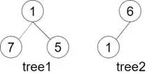 •示例 1:输入tree1 = [1,7,5], tree2 = [6,1],输出false;解释:tree2与tree1的一个子树没有相同的结构和节点值。
