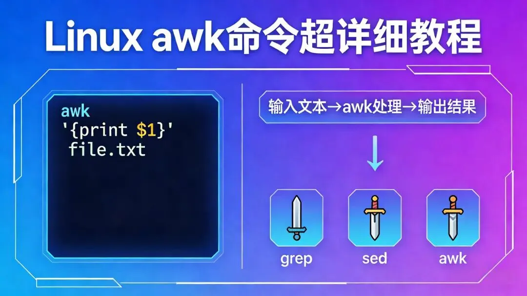 awk作为Linux文本处理“三剑客”(grep、sed、awk)的天花板,是文本分析、日志切割、数据统计、报表生成的终极神器。相比于grep检索、sed替换,awk更擅长列操作、数值计算、逻辑判断,能一行命令搞定复杂文本处理,是运维、开发、数据分析人员的必备技能。很多人觉得awk语法晦涩、变量难记,要么不敢上手,要么只会简单打印列,白白浪费这款神器。这篇教程彻底摒弃枯燥理论,全程零门槛白话讲解+全场景实战案例+避坑警示,覆盖99%日常工作需求,新手看完就能上手,老手可当速查手册,建议直接收藏转发,处理文本时随时翻。