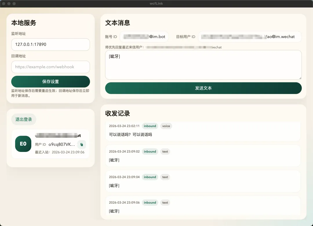 wcflink servewcflink versionwcflink accountswcflink events --limit 20wcflink login startwcflink login status login_xxxwcflink send-text --account-id xxx@im.bot --to-user-id yyy@im.wechat --text "hello"wcflink send-media --account-id xxx@im.bot --to-user-id yyy@im.wechat --file-path /abs/demo.jpg --type image
