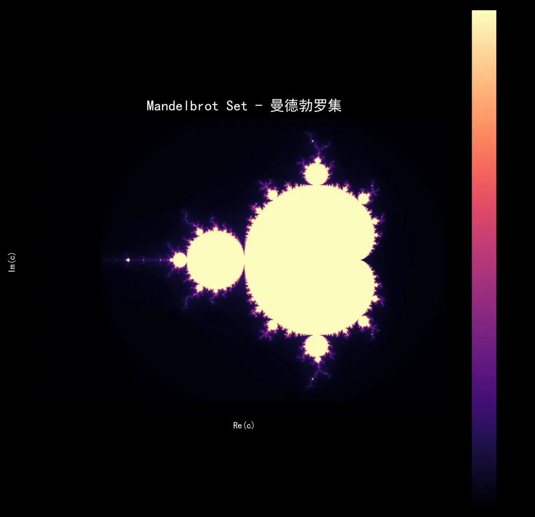import numpy as npimport matplotlib.pyplot as plt# 设置中文字体plt.rcParams['font.sans-serif'] = ['SimHei', 'DejaVu Sans']plt.rcParams['axes.unicode_minus'] = False# ================= 配置区域 =================WIDTH, HEIGHT = 800, 800 # 图像分辨率X_MIN, X_MAX = -2.5, 1.0 # 复平面X轴范围Y_MIN, Y_MAX = -1.25, 1.25 # 复平面Y轴范围MAX_ITER = 100 # 最大迭代次数(越多越精确)# ===========================================def mandelbrot(c, max_iter):"""计算单个复数点c的迭代次数核心公式:z = z² + c"""z = 0for n in range(max_iter):if abs(z) > 2: # 发散判断return nz = z * z + creturn max_iterdef generate_mandelbrot():"""生成曼德勃罗集图像"""print("🌌 正在计算曼德勃罗集...")# 创建复平面网格x = np.linspace(X_MIN, X_MAX, WIDTH)y = np.linspace(Y_MIN, Y_MAX, HEIGHT)X, Y = np.meshgrid(x, y)C = X + 1j * Y # 复数平面# 存储每个点的迭代次数M = np.zeros(C.shape, dtype=int)# 逐点计算(简单直观,可优化为向量化)for i in range(HEIGHT):for j in range(WIDTH):M[i, j] = mandelbrot(C[i, j], MAX_ITER)# 进度显示if (i + 1) % 100 == 0:print(f" 进度: {i + 1}/{HEIGHT} ({(i + 1) / HEIGHT * 100:.1f}%)")return M# ================= 主程序 =================M = generate_mandelbrot()# 创建图像print("🎨 正在渲染图像...")plt.figure(figsize=(10, 10))plt.imshow(M, cmap='magma', extent=[X_MIN, X_MAX, Y_MIN, Y_MAX])plt.colorbar(label='迭代次数')plt.title('Mandelbrot Set - 曼德勃罗集', fontsize=16, color='white')plt.xlabel('Re(c)', color='white')plt.ylabel('Im(c)', color='white')plt.gca().set_facecolor('black')plt.gcf().patch.set_facecolor('black')# 保存图像plt.savefig('mandelbrot.png', dpi=300, facecolor='black', bbox_inches='tight')print("✅ 图像已保存为 mandelbrot.png")