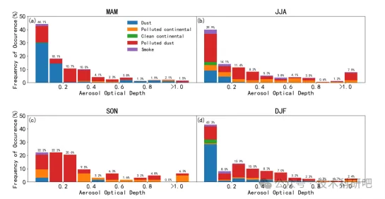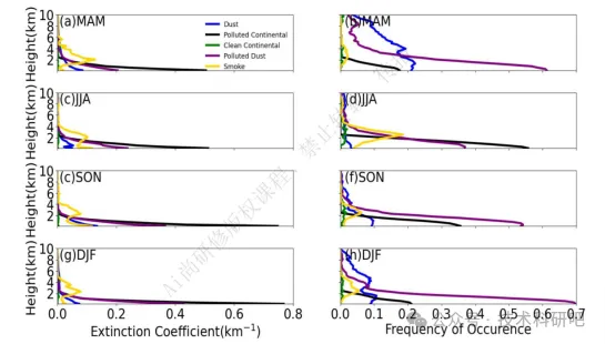 绘制气溶胶消光系数和出现率季节变化图(分析该地区季节变化导致气溶胶变化)