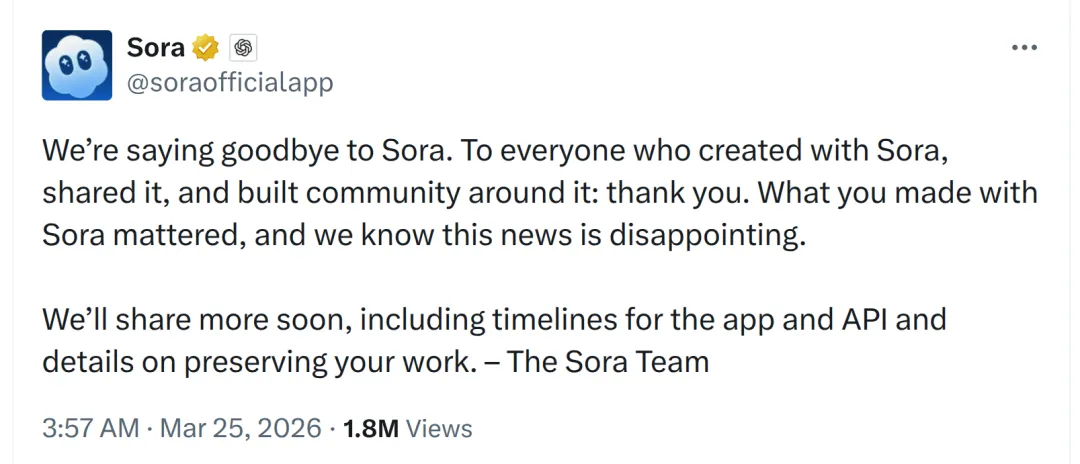 Sora 团队宣布将停止服务 Sora 应用及 API。感谢所有使用 Sora 创作、分享内容并参与社区建设的用户,你们的作品具有重要意义。尽管这一消息令人失望,但团队承诺将尽快公布应用和 API 的停用时间表,并提供关于如何保存用户作品的详细信息。更多更新将在未来陆续发布。