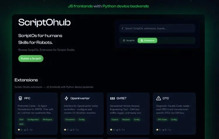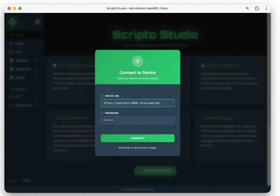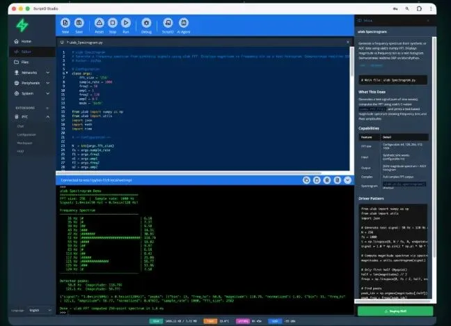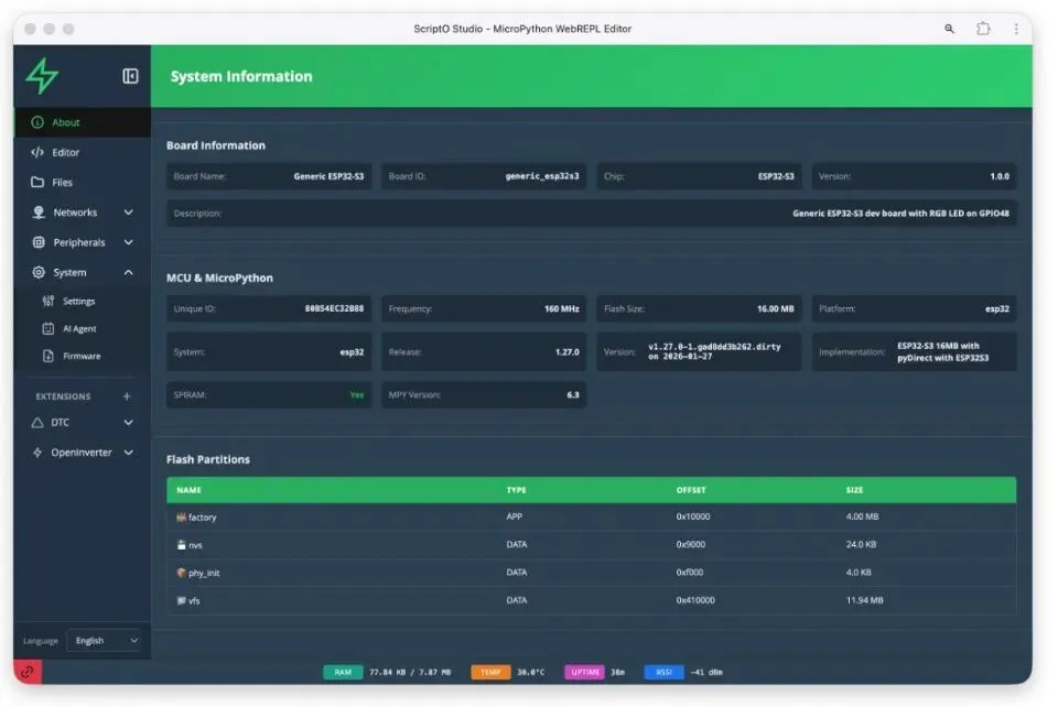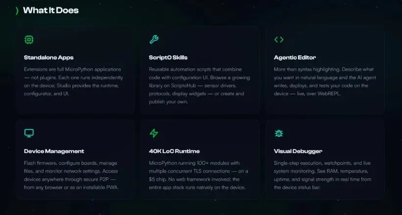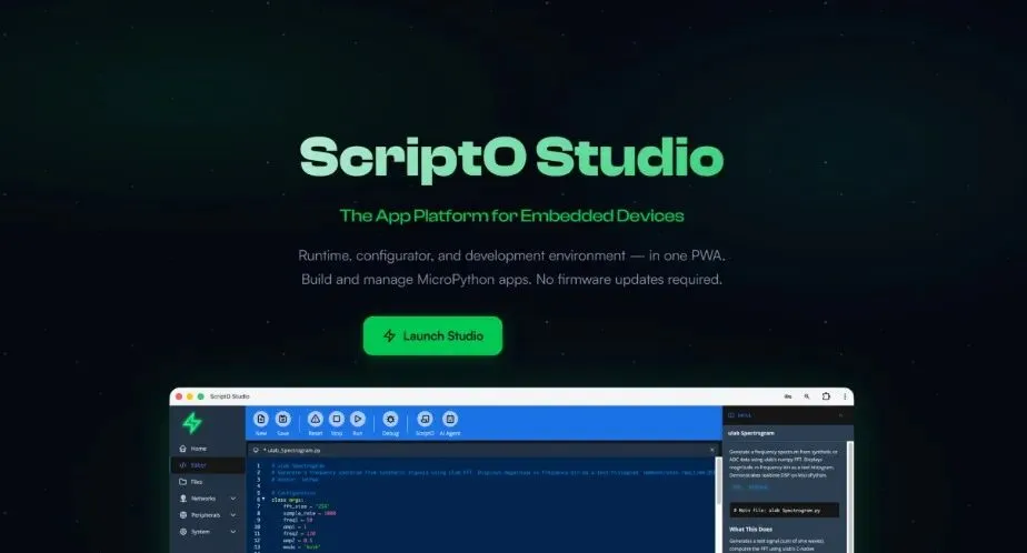 ScriptO Studio 是下一代嵌入式集成开发与执行环境(IDEE),专为运行 MicroPython 的设备打造。 核心就是一句话:**不用编译、不用刷固件,打开浏览器,说清楚你要设备做什么,它立刻帮你实现。**它是一个 PWA(渐进式网页应用),电脑、手机、平板都能跑,完全不需要安装任何客户端;底层通过安全 TLS/WebRTC 连接设备,所有 UI 和计算都在浏览器完成,不占设备一丝资源。