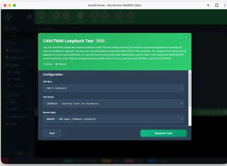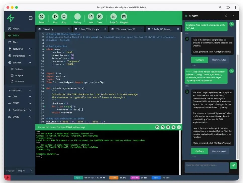 - 安装扩展 / 写代码新手:去 ScriptoHub 安装现成扩展(比如 CAN Loopback Test),一键部署 老手:用 AI Agent 描述需求,生成代码后直接运行