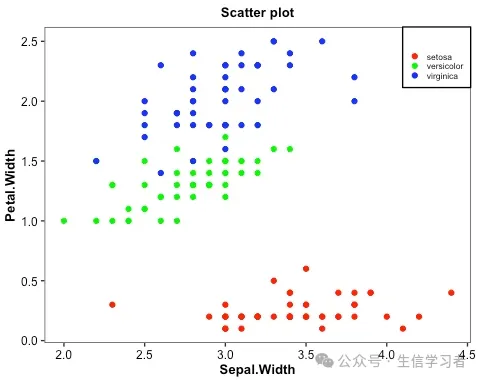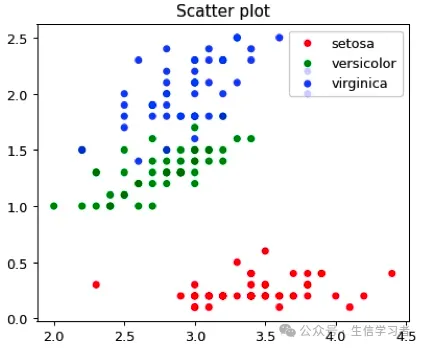 dat = r.iris # Python调用R内嵌数据使用r.dataspecies_map = {'setosa':1, 'versicolor':2, 'virginica':3}dat['Species'] = dat['Species'].map(species_map)import numpy as npimport matplotlib.pyplot as plt# plt.scatter(dat['Sepal.Width'], dat['Petal.Width'], c=dat['Species'],# alpha=0.8, edgecolors='none', s=30, label=["1", "2", "3"])# plt.title('Scatter plot in iris')# plt.xlabel('Sepal.Width (cm)')# plt.ylabel('Petal.Width (cm)')# plt.legend(loc=1)# plt.show()dat1 = (np.array(dat[dat.Species==1]['Sepal.Width']), np.array(dat[dat.Species==1]['Petal.Width']))dat2 = (np.array(dat[dat.Species==2]['Sepal.Width']), np.array(dat[dat.Species==2]['Petal.Width']))dat3 = (np.array(dat[dat.Species==3]['Sepal.Width']), np.array(dat[dat.Species==3]['Petal.Width']))mdat = (dat1, dat2, dat3)colors = ("red", "green", "blue")groups = ("setosa", "versicolor", "virginica")# step1 build figure backgroundfig = plt.figure()# step2 build axisax = fig.add_subplot(1, 1, 1, facecolor='1.0') # step3 build figurefor data, color, group in zip(mdat, colors, groups): x, y = data ax.scatter(x, y, alpha=0.8, c=color, edgecolors='none', s=30, label=group) plt.title('Scatter plot')plt.legend(loc=1) # step4 show figure in the screenplt.show()