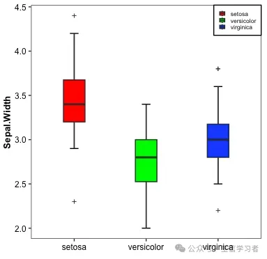 iris %>% mutate(Species=factor(Species, levels = c("setosa", "versicolor", "virginica"))) %>% ggplot(aes(x=Species, y=Sepal.Width, fill=Species))+ stat_boxplot(geom = "errorbar", width = .12)+ geom_boxplot(width = .3, outlier.shape = 3, outlier.size = 1)+ guides(fill=guide_legend(NULL, keywidth = .5, keyheight = .5))+ xlab("")+ theme_bw()+ scale_fill_manual(values = c("red", "green", "blue"))+ theme(plot.title = element_text(size = 10, color = "black", face = "bold", hjust = 0.5), axis.title = element_text(size = 10, color = "black", face = "bold"), axis.text = element_text(size = 9, color = "black"), text = element_text(size = 8, color = "black"), strip.text = element_text(size = 9, color = "black", face = "bold"), panel.grid = element_blank(), legend.position = c(1, 1), legend.justification = c(1, 1), legend.background = element_rect(fill="white", color = "black"))