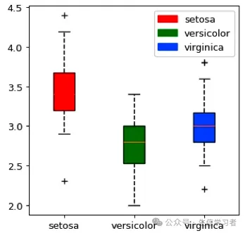 dat = r.iris # Python调用R内嵌数据使用r.dataspecies_map = {'setosa':1, 'versicolor':2, 'virginica':3}dat['Species'] = dat['Species'].map(species_map)import numpy as npimport matplotlib.pyplot as pltimport matplotlib.patches as mpatchesdat11 = (np.array(dat[dat.Species==1]['Sepal.Width']))dat21 = (np.array(dat[dat.Species==2]['Sepal.Width']))dat31 = (np.array(dat[dat.Species==3]['Sepal.Width']))mdat2 = (dat11, dat21, dat31)colors = ("red", "green", "blue")groups = ("setosa", "versicolor", "virginica")fig = plt.figure()axes = fig.add_subplot(facecolor='1.0')bplot = axes.boxplot(mdat2, patch_artist=True, notch=0, sym='+', vert=1, whis=1.5, whiskerprops = dict(linestyle='--',linewidth=1.2, color='black'))# colorfor patch, color in zip(bplot['boxes'], colors): patch.set_facecolor(color)# axes labelsplt.setp(axes, xticks=[1,2,3], xticklabels=["setosa", "versicolor", "virginica"])red_patch = mpatches.Patch(color='red', label='setosa')green_patch = mpatches.Patch(color='green', label='versicolor')blue_patch = mpatches.Patch(color='blue', label='virginica')plt.legend(handles=[red_patch, green_patch, blue_patch], loc=1)plt.show()