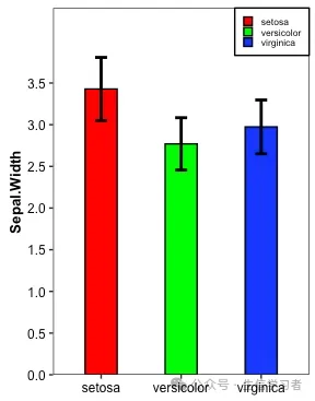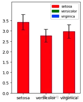 dat = r.iris # Python调用R内嵌数据使用r.dataspecies_map = {'setosa':1, 'versicolor':2, 'virginica':3}dat['Species'] = dat['Species'].map(species_map)import numpy as npimport pandas as pdimport matplotlib.pyplot as pltmean = list(dat['Sepal.Width'].groupby(dat['Species']).mean())sd = list(dat.groupby('Species').agg(np.std, ddof=0)['Sepal.Width'])colors = ["red", "green", "blue"]df = pd.DataFrame({'mean':mean}, index=["setosa", "versicolor", "virginica"])df.plot(kind='bar', alpha=0.75, rot=0, edgecolor='black', yerr=sd, align='center', ecolor='black', capsize=5, color=colors, ylim=(0.0, 4.4), yticks=list(np.arange(0, 4.0, 0.5)))# xlabelplt.xlabel('')plt.ylabel('Sepal.Width')# legendred_patch = mpatches.Patch(color='red', label='setosa')green_patch = mpatches.Patch(color='green', label='versicolor')blue_patch = mpatches.Patch(color='blue', label='virginica')plt.legend(handles=[red_patch, green_patch, blue_patch], # color and group loc=1, # location prop={'size': 8}) # size plt.show()