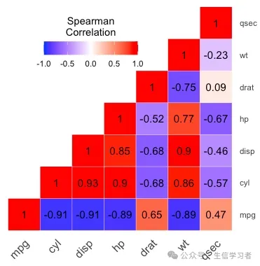 get_upper_tri <- function(x){ x[upper.tri(x)] <- NA return(x)}round(cor(mtcars[, c(1:7)], method = "spearman"), 2) %>% get_upper_tri() %>% reshape2::melt(na.rm = TRUE) %>% ggplot(aes(x=Var1, y=Var2, fill=value))+ geom_tile(color = "white")+ scale_fill_gradient2(low = "blue", high = "red", mid = "white", midpoint = 0, limit = c(-1,1), space = "Lab", name="Spearman\nCorrelation")+ theme_minimal()+ guides(fill = guide_colorbar(barwidth = 7, barheight = 1, title.position = "top", title.hjust = 0.5))+ coord_fixed()+ geom_text(aes(label = value), color = "black", size = 4)+ scale_y_discrete(position = "right") + theme(axis.title.x = element_blank(), axis.title.y = element_blank(), axis.text.x = element_text(angle = 45, vjust = 1, size = 12, hjust = 1), panel.grid.major = element_blank(), panel.border = element_blank(), panel.background = element_blank(), axis.ticks = element_blank(), legend.justification = c(1, 0), legend.position = c(0.6, 0.7), legend.direction = "horizontal")