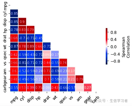 import pandas as pd import numpy as npimport matplotlib.pyplot as pltimport seaborn as snscorr = r.mtcars.corr()mask = np.zeros_like(corr)mask[np.triu_indices_from(mask)] = Truef, ax = plt.subplots(figsize=(6, 5))heatmap = sns.heatmap(corr, vmin=-1, vmax=1, mask=mask, center=0, # , orientation='horizontal' cbar_kws=dict(shrink=.4, label='Spearman\nCorrelation', ticks=[-.8, -.4, 0, .4, .8]), annot_kws={'size': 8, 'color': 'white'}, #cbar_kws = dict(use_gridspec=False,location="right"), linewidths=.2, cmap = 'seismic', square=True, annot=True, xticklabels=corr.columns.values, yticklabels=corr.columns.values)#add the column names as labelsax.set_xticklabels(corr.columns, rotation = 45)ax.set_yticklabels(corr.columns)sns.set_style({'xtick.bottom': True}, {'ytick.left': True})#heatmap.get_figure().savefig("heatmap.pdf", bbox_inches='tight')plt.show()