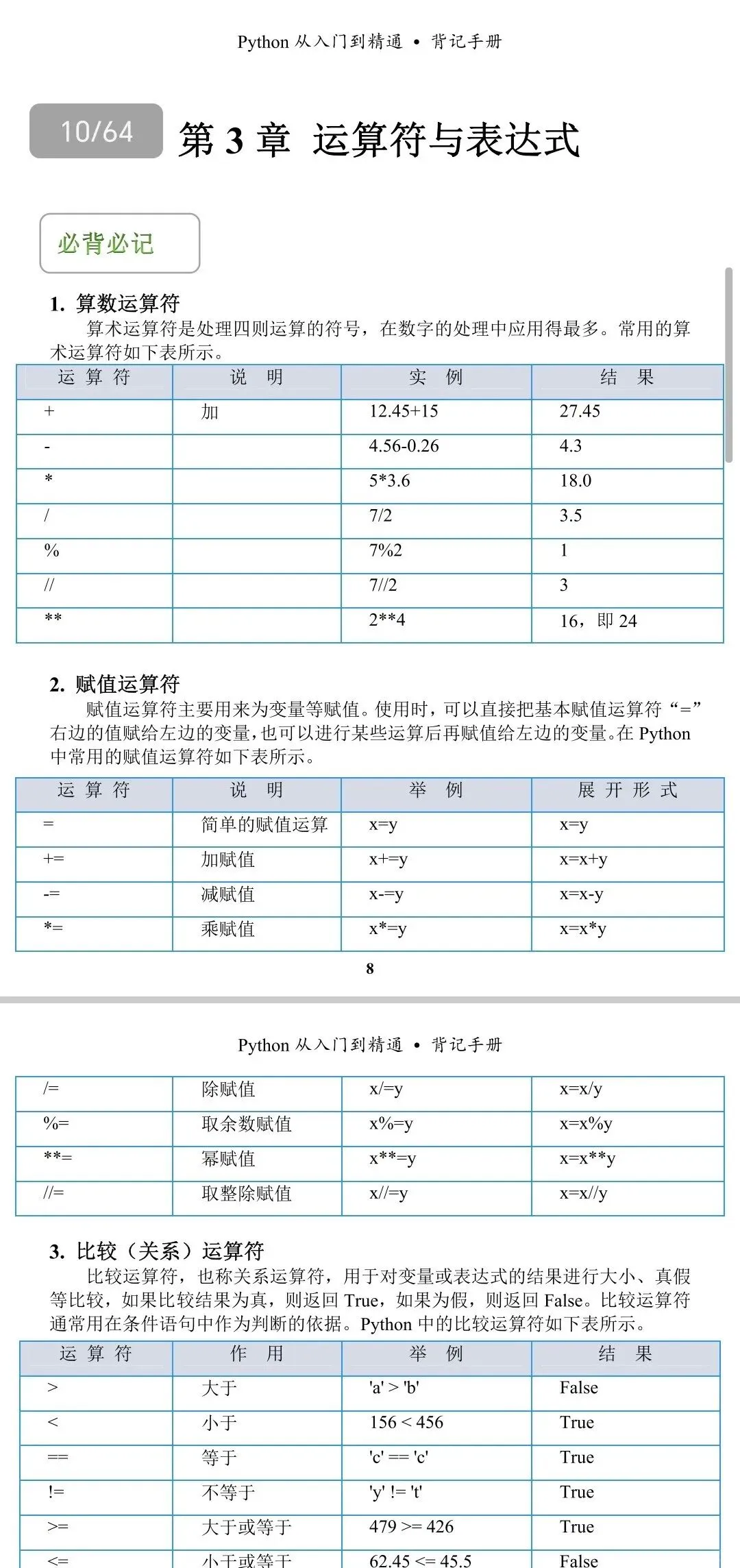 这本书的一大特点是轻量却不失全面。全书仅有64页,却涵盖了从入门到进阶的核心内容。它被许多学习者誉为“Python界的新华字典”,将所有常用的基础知识点和语法精炼地编写其中。无论是数据类型、流程控制,还是函数、面向对象编程,都能在这本手册中找到清晰的答案。