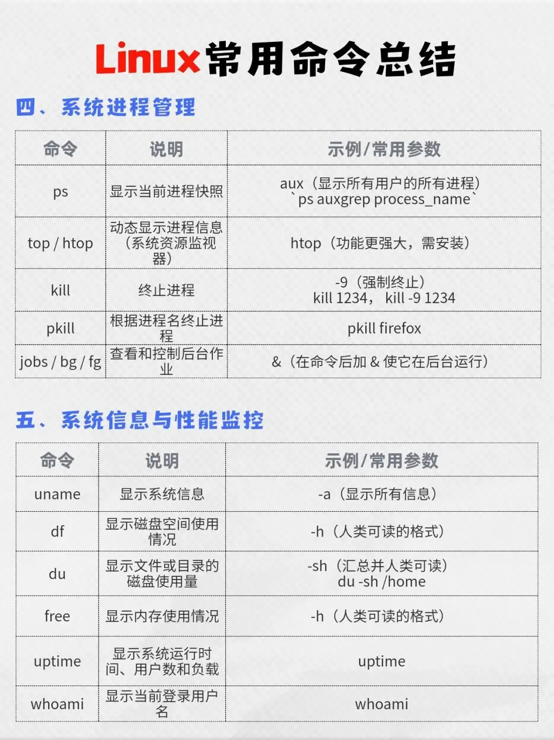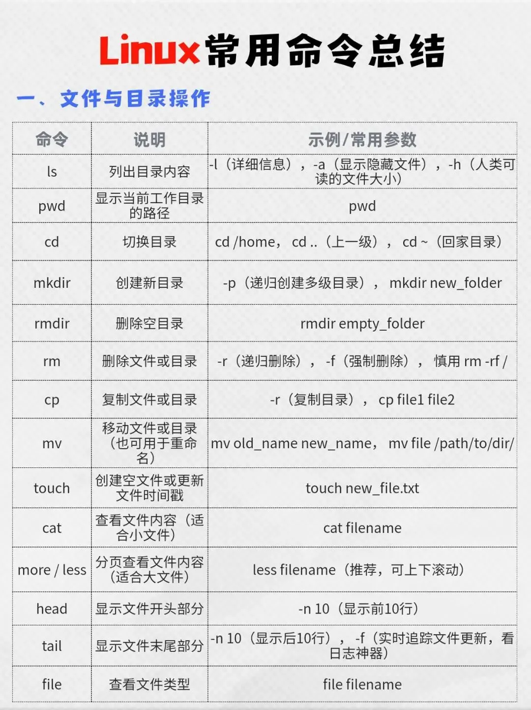 Linux 命令看着多,其实常用的也就这几十条,多敲几次肌肉记忆就有了~ 下次排查问题、部署服务,直接翻这张表,效率直接起飞!