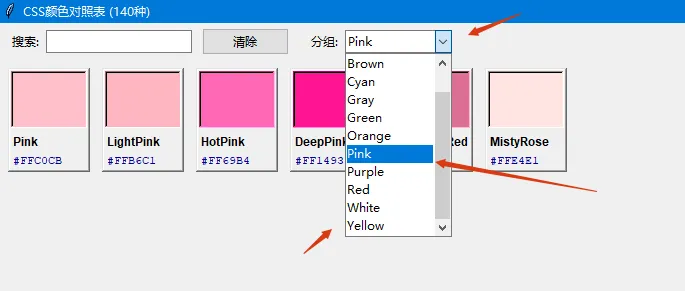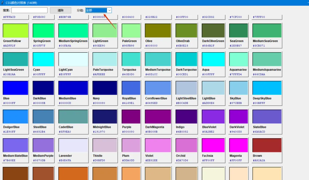 1. 完整 CSS 颜色集:包含约 140 种标准 CSS 颜色,涵盖红、粉、橙、黄、绿、青、蓝、紫、棕、灰、白等色系。每个颜色都带有预定义的分组,便于分类浏览。