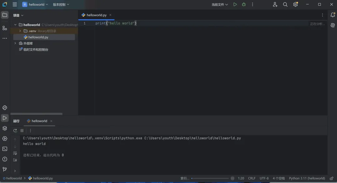 如果下面输出了 hello world,那么恭喜你,Python第一个项目运行成功!