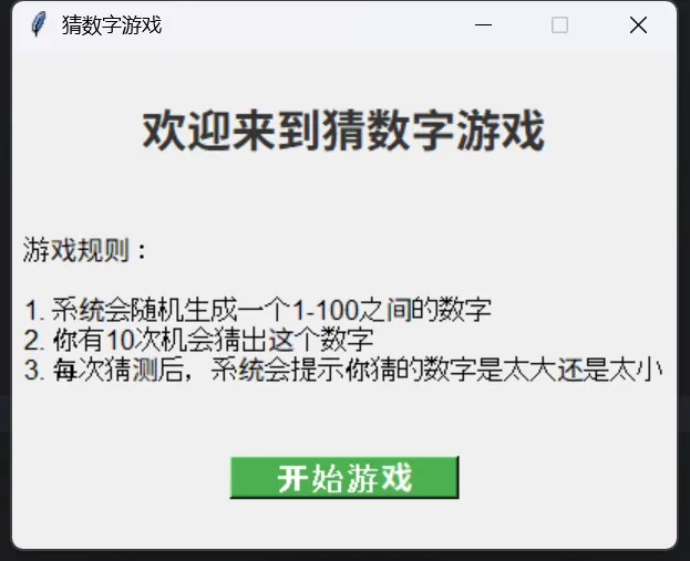 import tkinter as tkclass WelcomePage(tk.Frame): def __init__(self, parent, controller): super().__init__(parent) self.controller = controller self.create_widgets() def create_widgets(self): # 标题 title_label = tk.Label( self, text="欢迎来到猜数字游戏", font=("Arial", 20, "bold"), fg="#333333" ) title_label.pack(pady=30) # 游戏说明 instructions = tk.Label( self, text="游戏规则:\n\n" "1. 系统会随机生成一个1-100之间的数字\n" "2. 你有10次机会猜出这个数字\n" "3. 每次猜测后,系统会提示你猜的数字是太大还是太小", font=("Arial", 12), justify="left" ) instructions.pack(pady=10) # 开始按钮 start_button = tk.Button( self, text="开始游戏", font=("Arial", 14, "bold"), bg="#4CAF50", fg="white", padx=20, pady=10, command=lambda: self.controller.start_game() ) start_button.pack(pady=30)