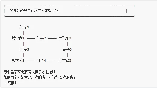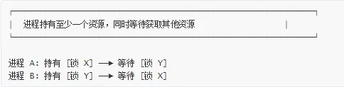 时间线:T1: 进程 A 获取 lock_aT2: 进程 B 获取 lock_bT3: 进程 A 等待 lock_b (被 B 持有)T4: 进程 B 等待 lock_a (被 A 持有)→ 死锁!