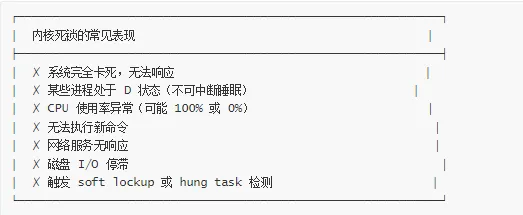 | 死锁 | 互相等待资源 | 低或正常 | 通常不可恢复 | lockdep, hung task |