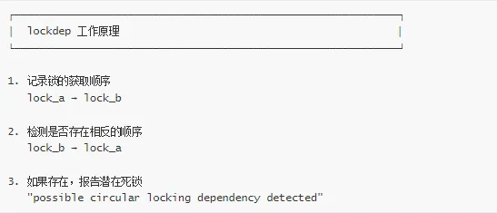 # 内核配置CONFIG_PROVE_LOCKING=yCONFIG_LOCK_STAT=yCONFIG_DEBUG_LOCK_ALLOC=yCONFIG_DEBUG_LOCKDEP=y# 运行时检查cat /proc/lockdepcat /proc/lockdep_stats