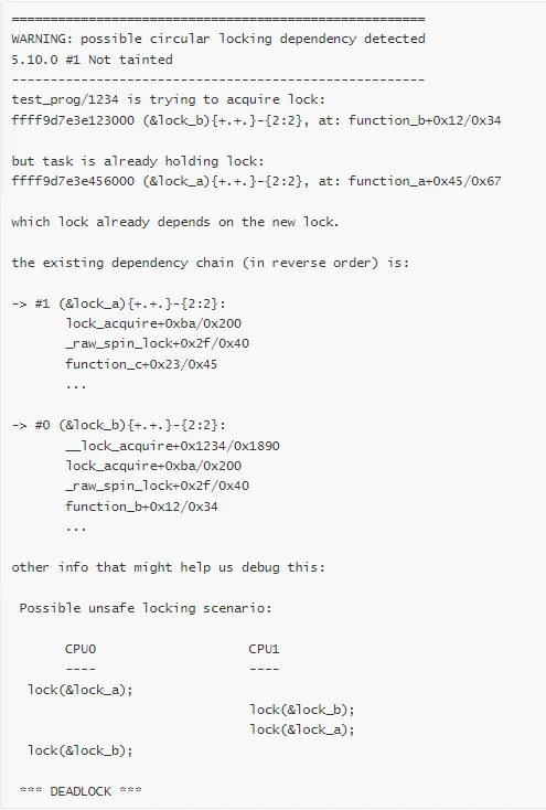 // 进程 Aspin_lock(&lock_a);spin_lock(&lock_b);// 进程 Bspin_lock(&lock_b);spin_lock(&lock_c);// 进程 Cspin_lock(&lock_c);spin_lock(&lock_a);// 循环:A → B → C → A