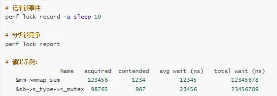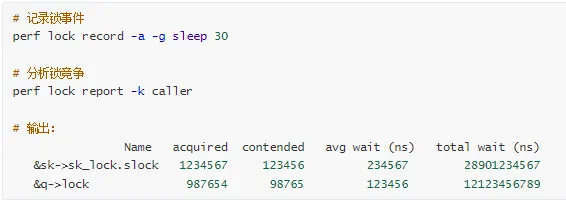 # 记录所有 CPU 的锁事件perf lock record -a -g sleep 30# 按 CPU 分析perf lock report --sort=cpu# 查看锁竞争热点perf lock contention -a -b