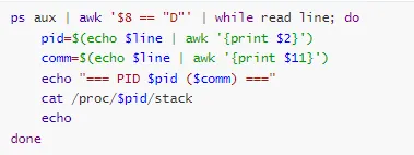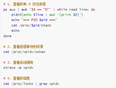 # 查看所有 D 状态进程ps aux | awk'$8 == "D"'# 查看进程调用栈cat /proc/<pid>/stack# 查看进程持有的锁cat /proc/<pid>/locks# 查看所有锁cat /proc/locks