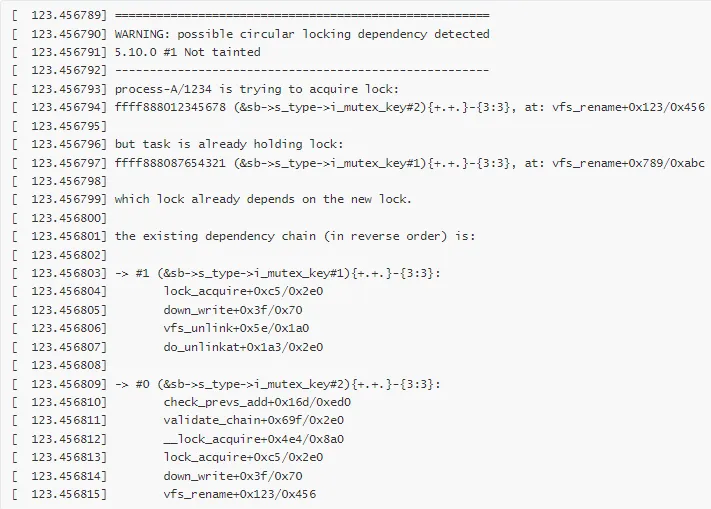 # 查看进程 A 的调用栈cat /proc/1234/stack[<0>] inode_lock+0x1e/0x30[<0>] vfs_rename+0x123/0x456[<0>] do_renameat2+0x4a3/0x5e0[<0>] __x64_sys_renameat2+0x4b/0x60[<0>] do_syscall_64+0x33/0x40[<0>] entry_SYSCALL_64_after_hwframe+0x44/0xa9# 查看进程 B 的调用栈cat /proc/5678/stack[<0>] inode_lock+0x1e/0x30[<0>] vfs_unlink+0x5e/0x1a0[<0>] do_unlinkat+0x1a3/0x2e0[<0>] __x64_sys_unlinkat+0x3f/0x50[<0>] do_syscall_64+0x33/0x40[<0>] entry_SYSCALL_64_after_hwframe+0x44/0xa9