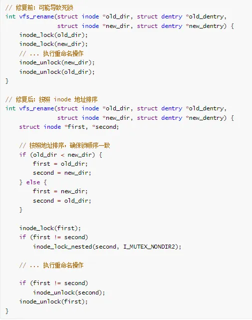 进程 A (rename):lock(inode_old_dir) -> lock(inode_new_dir)进程 B (unlink):lock(inode_new_dir) -> lock(inode_old_dir)