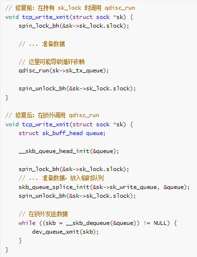 锁持有链:sk_lock -> qdisc_lock -> dev_lock -> sk_lock (循环!)
