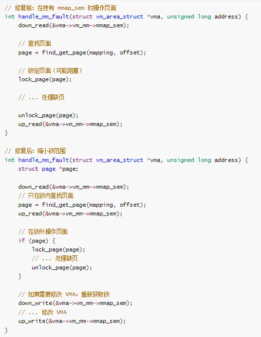 // 某些读写锁实现不支持递归void recursive_read(void) {read_lock(&rw_lock);// 调用另一个函数helper_function(); // 内部也获取读锁read_unlock(&rw_lock);}void helper_function(void) {read_lock(&rw_lock); // 可能死锁// ...read_unlock(&rw_lock);}