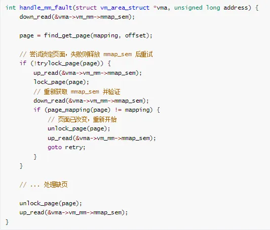 // 进程 A:写文件void write_file(void) {mutex_lock(&inode->i_mutex);// 写操作需要分配内存buffer=kmalloc(size, GFP_KERNEL);// 内存不足,触发回收// 回收需要写回脏页// 写回需要获取 i_mutex// 死锁!}