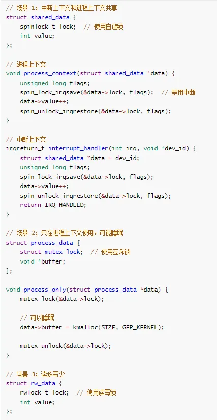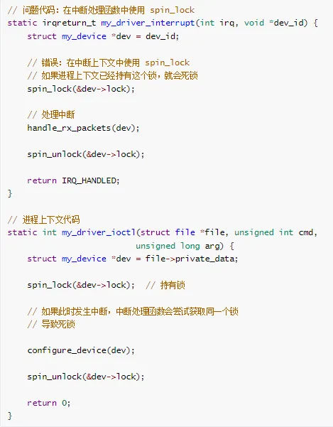 // 进程上下文void process_function(void) {spin_lock(&my_lock);// ... 临界区 ...// 此时中断发生!spin_unlock(&my_lock);}// 中断处理程序void interrupt_handler(void) {spin_lock(&my_lock); // 死锁!等待进程上下文释放// ...spin_unlock(&my_lock);}