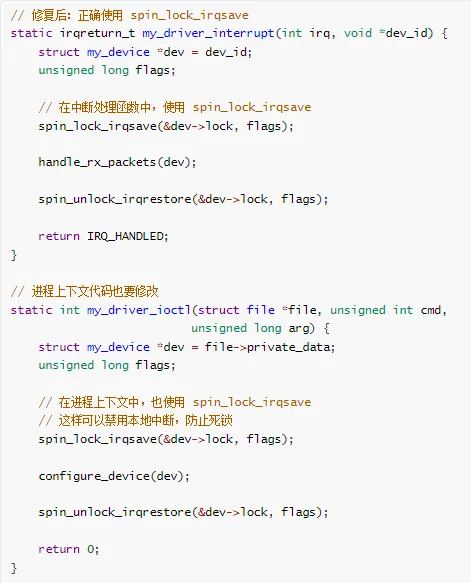 // 使用 spin_lock_irqsave 禁用中断void process_function(void) {unsigned long flags;spin_lock_irqsave(&my_lock, flags);// ... 临界区(中断被禁用)...spin_unlock_irqrestore(&my_lock, flags);}// 中断处理程序void interrupt_handler(void) {spin_lock(&my_lock); // 安全:进程上下文已禁用中断// ...spin_unlock(&my_lock);}