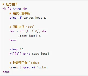 # 启用 lockdepCONFIG_PROVE_LOCKING=y# 运行压力测试stress-ng --all4--timeout 1h# 使用 syzkaller 进行模糊测试# https://github.com/google/syzkaller
