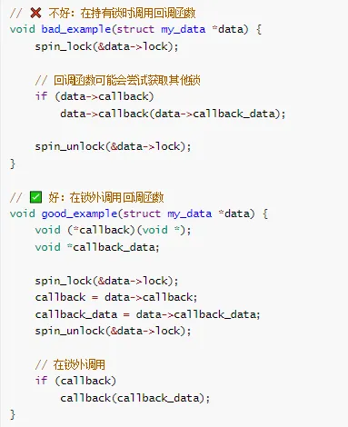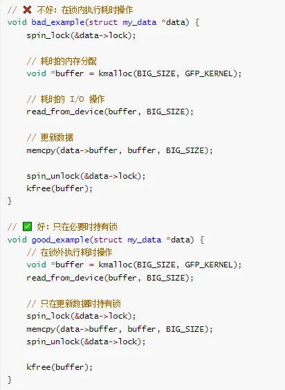 void example2(void) {// 在锁外分配内存void *buffer=kmalloc(SIZE, GFP_KERNEL);if (!buffer)return;spin_lock(&my_lock);// 使用 bufferspin_unlock(&my_lock);kfree(buffer);}