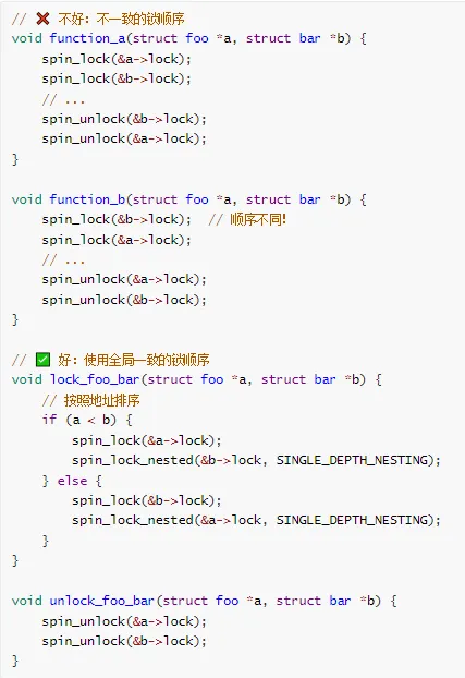 // 统一锁顺序:总是先获取 lock_a,再获取 lock_bvoid function_a(void) {spin_lock(&lock_a);spin_lock(&lock_b);// ...spin_unlock(&lock_b);spin_unlock(&lock_a);}void function_b(void) {spin_lock(&lock_a); // 改为先获取 lock_aspin_lock(&lock_b);// ...spin_unlock(&lock_b);spin_unlock(&lock_a);}