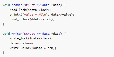 rwlock_t my_rwlock;// 读锁read_lock(&my_rwlock);// 读操作read_unlock(&my_rwlock);// 写锁write_lock(&my_rwlock);// 写操作write_unlock(&my_rwlock);