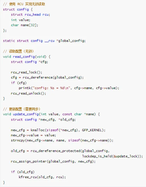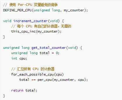 // 策略 1:拆分大锁// 将一个保护多个数据结构的大锁拆分为多个小锁// 策略 2:使用 RCU// 对于读多写少的场景,使用 RCU 代替读写锁// 策略 3:使用无锁数据结构// 使用原子操作、Per-CPU 变量等// 策略 4:重新设计锁层次// 建立清晰的锁层次结构,文档化锁顺序