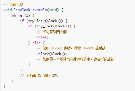 // 进程 Aspin_lock(&lock_x); // 持有 lock_xspin_lock(&lock_y); // 等待 lock_y// 进程 Bspin_lock(&lock_y); // 持有 lock_yspin_lock(&lock_x); // 等待 lock_x