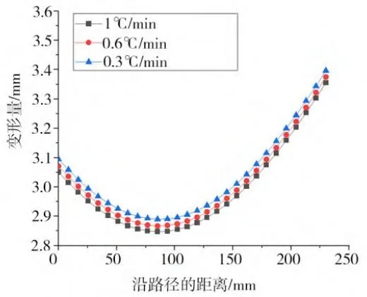 ✅ 0.3℃/min 时最大变形 3.397mm,比 1℃/min 高 1.22%