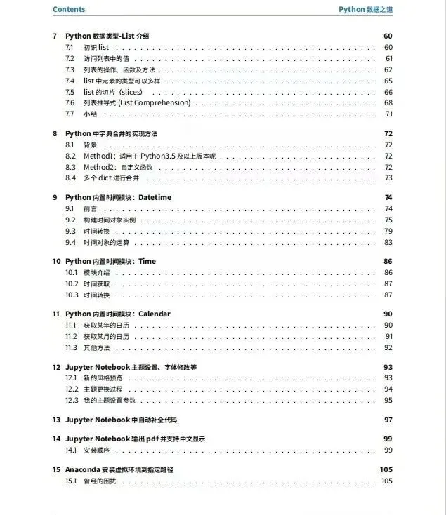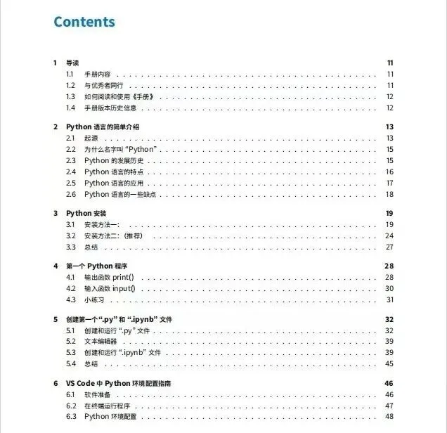 全书内容覆盖了从入门到实战的全链路知识体系。在基础部分,手册详细讲解了Python的安装与环境配置,特别是针对VSCode和Jupyter Notebook等主流工具的搭建给出了清晰指引。核心语法部分则深入剖析了字符串、列表(List)、字典(Dict)等数据结构,以及Numpy、Pandas两大数据分析利器。