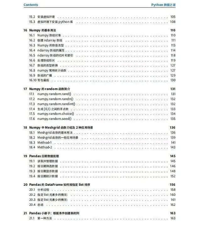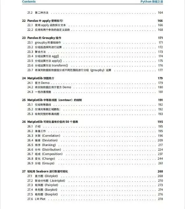 值得一提的是,该手册在Pandas的应用上着墨颇多,涵盖了数据筛选、Groupby分组操作、日期数据处理以及表格样式设置等高阶技巧,非常适合需要进行数据清洗与分析工作的读者。在可视化方面,手册整合了Matplotlib、Seaborn、Plotly等多个绘图库的实战案例,甚至包含了“最有价值的50个图表”这类精华总结。