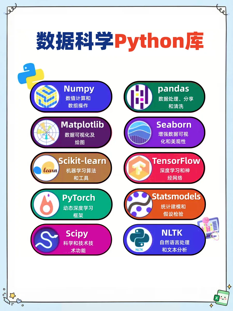 一张图搞定数据科学 Python 库!图中总结了10个工作中使用到的最强python库。