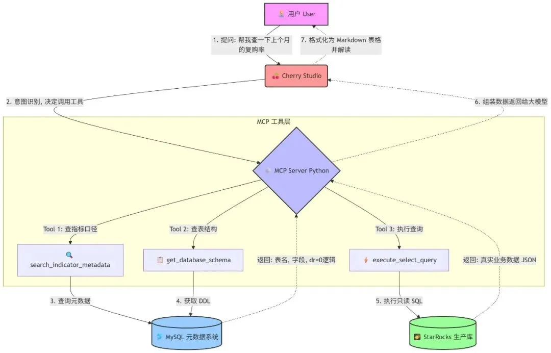 这就好比,我们在让实习生去仓库(StarRocks)搬砖之前,先让他去查阅了公司的《数据字典》(MySQL)。 这样写出来的 SQL,准确率直线上升!