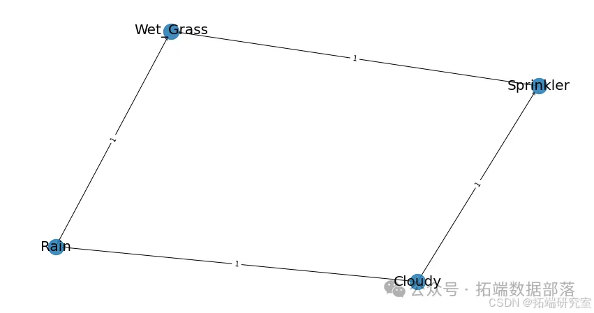 学习所得网络准确反映了真实因果关系:阴天状态同时影响洒水器使用概率和降雨概率,而两者共同决定草地湿润状态。