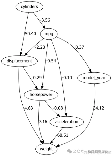 # 载入连续变量数据集# 连续变量结构发现cont_moel = bn.truc# 可视化参数关联bn.pot(cot_del)