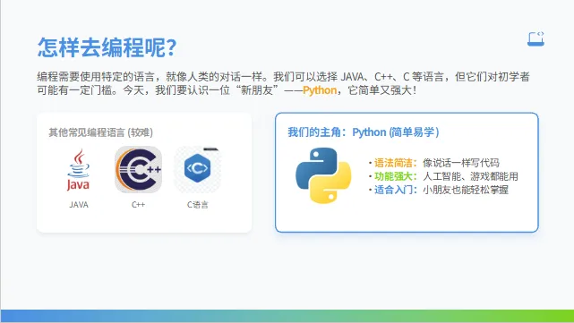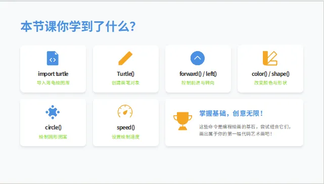 本节课立足小学 Python 入门课堂,难度适中、节奏清晰、动手性极强,让孩子第一次写代码就有成就感: