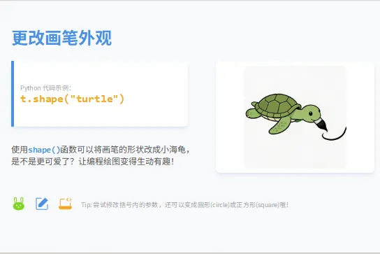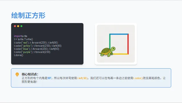 会导入并使用海龟绘图库,掌握基础画笔指令;