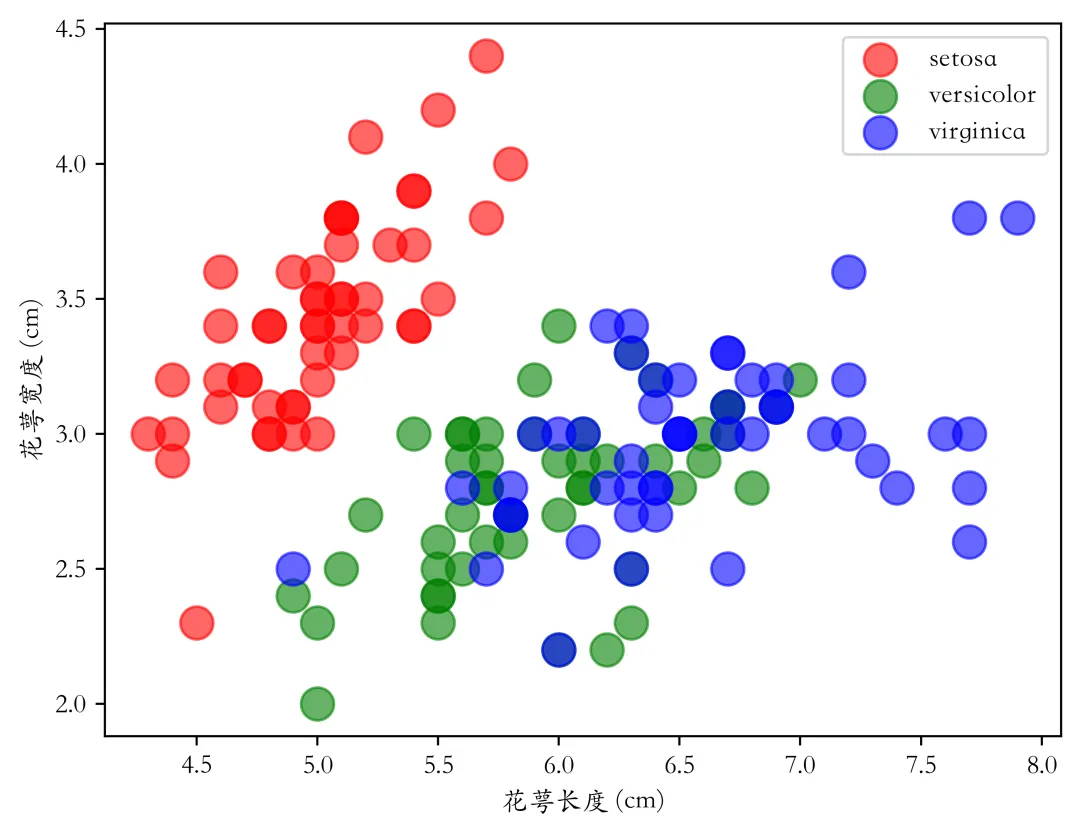 # 9.2.1_01# -*- encoding: utf-8 -*-'''未经过允许禁止转载!@Author : 公众号: pythonic生物人@Desc : 9.2.1 分类散点图(不同颜色)'''import matplotlib.pyplot as pltimport pandas as pdfrom mplfonts import use_fontiris = pd.read_csv('./matplotlib_data/iris.csv') labels = iris['鸢尾花种类']categories = labels.unique() #提取鸢尾花的种类colors = {'setosa': 'red','versicolor': 'green','virginica': 'blue'} #设置不同的颜色fig, ax = plt.subplots(dpi=500)for category in categories: subset = iris[labels == category] ax.scatter( subset['花萼长度 (cm)'], subset['花萼宽度 (cm)'], label=category, # 设置分类标签,方便图例中使用 color=colors.get(category, 'gray'), # 设置分类颜色 s=150, alpha=0.6)ax.set_xlabel('花萼长度 (cm)')ax.set_ylabel('花萼宽度 (cm)')ax.legend()plt.show()